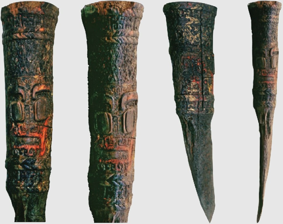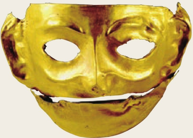金面具高3.74厘米,宽4.92厘米,眉毛成弧形,耳朵外展,鼻梁直挺,嘴角挂着盈盈笑意。(图3-1)金沙人用黄金铸造这样一个笑脸,说明此人地位非常尊贵,或许只有古蜀王才能享此殊荣。当时统治金沙的,被推测为蜀王杜宇,《华阳国志》记载,杜宇东征西战,开辟了疆域空前的古蜀国。