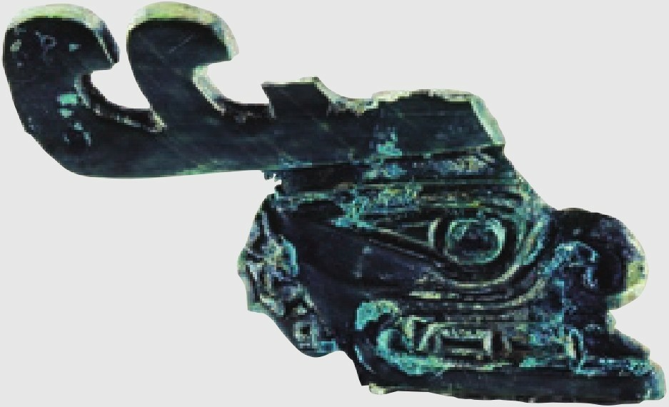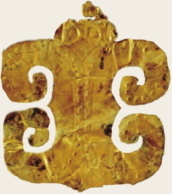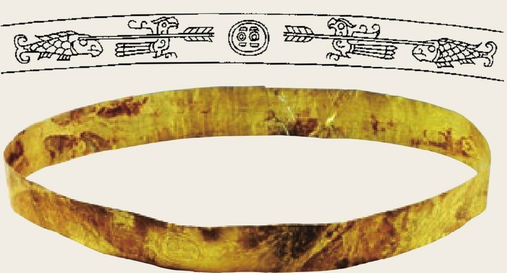 3-3金冠带上,一条鱼被一支箭穿过,这个图案可能寓意着部族的祭祀、战争等大事