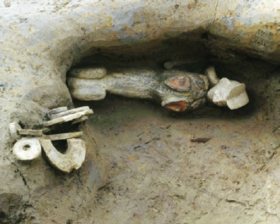 3-9金沙遗址(梅苑)中心发掘区出土的石跪立人像、石虎、玉璧