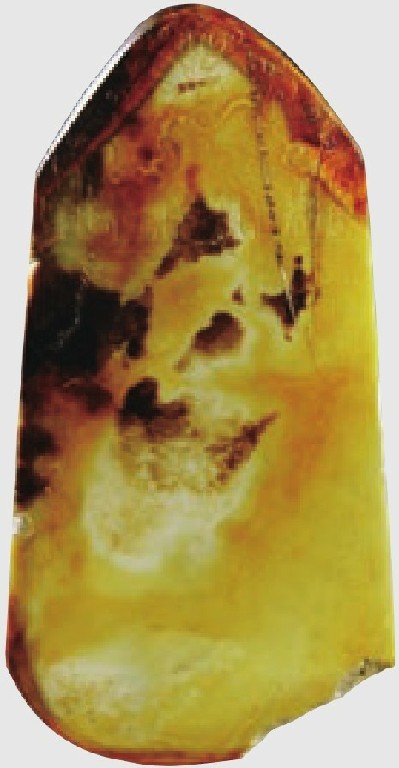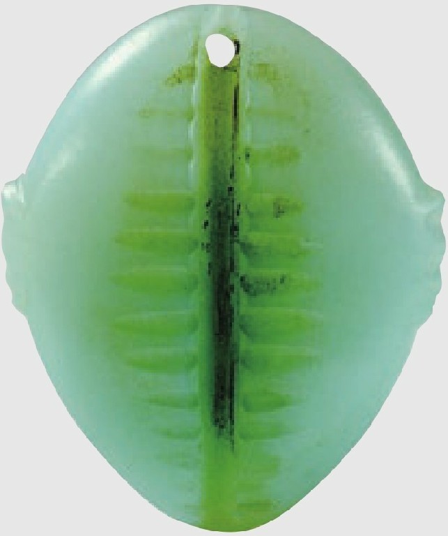 长约3厘米的玉贝,玉质白中泛青,温润细腻,中间如同海贝雕有对称排列的14道凹槽(图3-14);玉面人像通体绿色,正反两面对称,人面雕刻长方形的眉毛、圆瞪的眼睛、尖尖的耳朵,头上还戴着头冠,口中隐约能看到三颗牙齿(图3-16)。