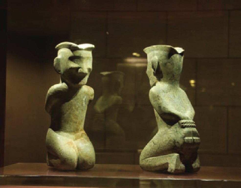 跪立石像的裸体造型,是最神秘的谜团,在古代,人们什么时候可能会一丝不挂?在流传至今的神话或传说中有详细记载,就是在人与神交流的时候。金沙博物馆研究员王方认为,这种现象非但不低俗,恰恰是献祭者为了表达对崇高的受祭对象——日月、天地、山川、佛祖等的虔诚、敬畏,在他们看来,尽可能以脱俗的身子献祭,才是最神圣的,比如中国国家博物馆藏战国螭虎噬人纹玉珮、安徽阜南商代虎食人青铜尊等器物上,那些正在升天、成仙抑或献祭的人样,几乎都是赤裸的,而红山文化、山西晋侯墓等出土的与天地沟通的玉雕巫师形象,也多是露脐或显乳的。