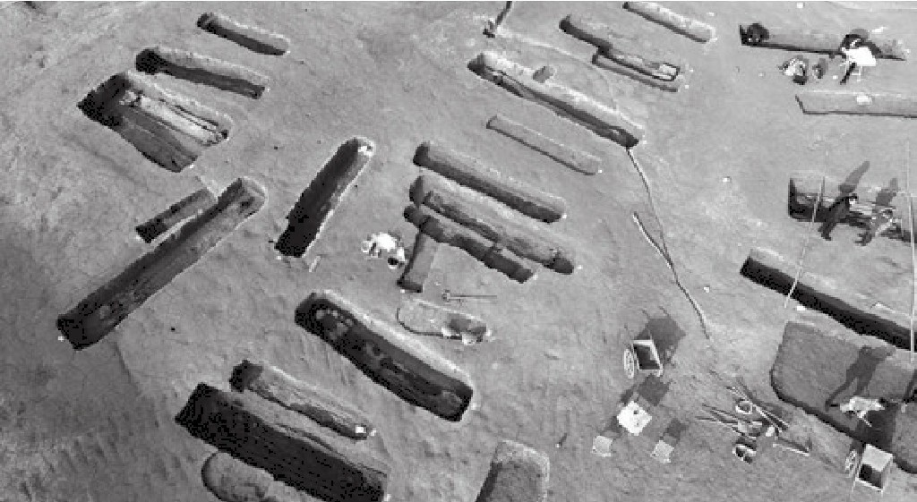 4-1、2盐井沟有60座船棺,是少见的大型船棺群,墓葬呈横向密集排列,大多为战国晚期