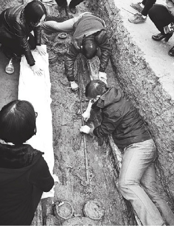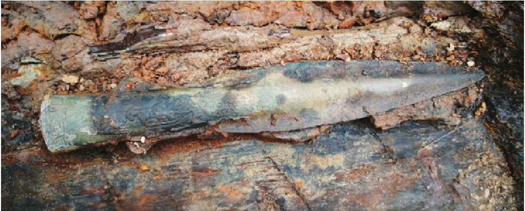 4-7蒲江盐井沟出土铜矛场景,令人惊奇的是,长达1.8米的矛杆尚保存完好