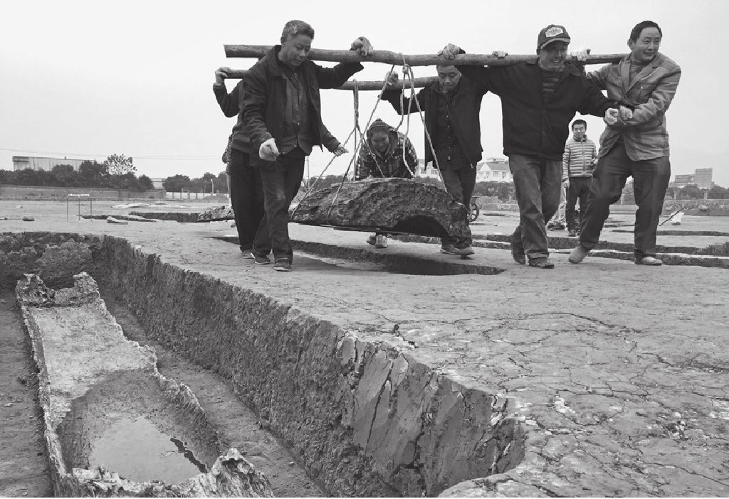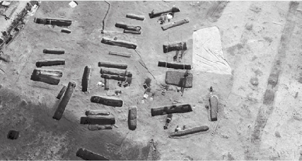更多墓葬已经完成了清理,一具具庞大的木棺暴露在长方形墓坑中,由于在地下埋藏了千年之久,早就炭化为珍贵的乌木。木棺无一例外,均由整根楠木雕凿而成,其做法是将楠木截头去尾,只留取中间一截。将木料去掉三分之一,刮掉树皮后用作棺盖,再将剩余部分中间挖空,形如船舱,最后将一头凿出弧度,有如船头。这样的墓葬,考古学上形象地称之为“船棺”。