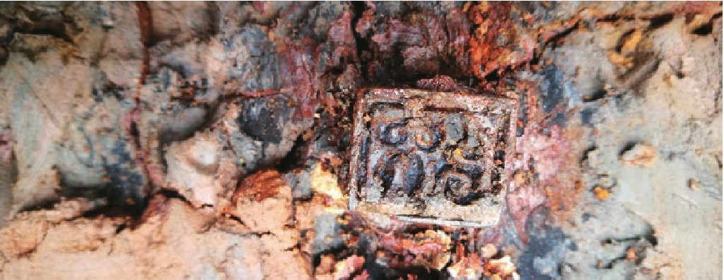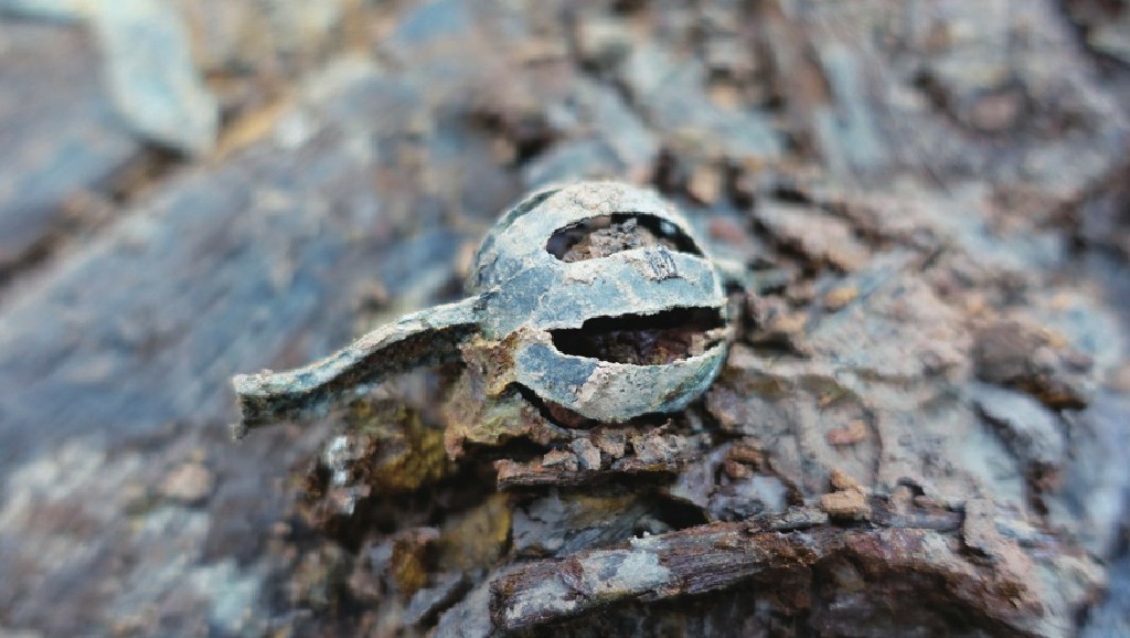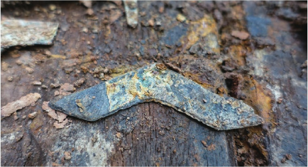 4-4船棺底部,一件铜璜暴露出来,铜璜是西南少数部族模仿玉璜制成的