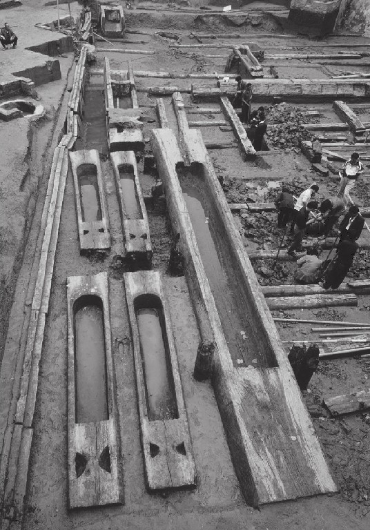 四川各地虽有船棺出土,但规模最大的,当属成都商业街船棺。2000年7月29日深夜,成都商业街四川省委大院机关食堂工地,工人在地下挖出几段巨大的乌木,一些色泽亮丽的漆器隐约可见。考古工作者闻讯赶到现场,意识到这是一处船棺合葬群,墓中有船棺9具,10米以上的4具,最长的一具18.8米,直径1.7米,由整根楠木雕凿而成,不仅国内船棺无可比肩,在世界范围内都找不到如此巨大的船棺。制造这些船棺的楠木,其树龄至少在500年以上。(图4-15)