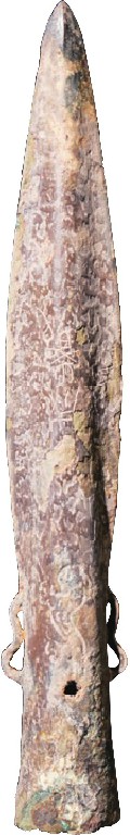 盐井沟一件青铜矛上,有线刻的“成都”二字,这也是首次在成都战国遗址中发现“成都”字样。(图4-6)这件珍贵的成都矛,似乎也验证了《华阳国志》的记载,开明九世(一说开明五世)梦见城郭在移动,遂把都城迁到成都,把宗庙也迁了过来,并仿照周人迁都“一年成聚,二年成邑,三年成都”的说法,取名成都。从那以后,这个名字就深深烙在了这片土地上,直到今天依旧没有更改过。
