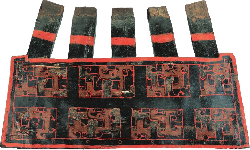 商业街船棺曾经被盗,青铜器几乎荡然无存,残留的漆器却依旧透露着皇家之气。漆器有几案、床、梳子、瑟、虎头、编钟、基座等,间绘瑰丽奇异的龙纹、鸟纹、卷云纹,色彩艳丽,纹饰斑斓,由此可以管窥开明王朝漆匠精湛的手艺。春秋战国时期的漆器极为珍贵,只有王族才能享用。(图4-16)