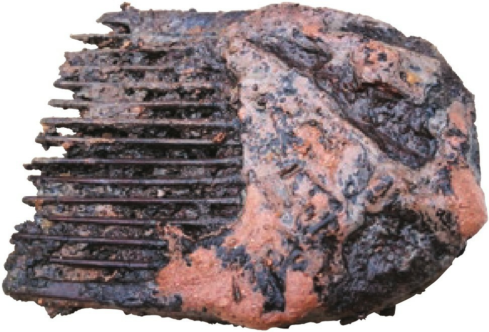 临近的M28号墓就没有那么剑拔弩张了。棺室中,一件V形铜璜半掩在淤泥中,表面的斜线纹隐约可见,璜是商周时期王公贵族的配饰,铜璜则是西南少数部族模仿玉璜制成的(图4-4);另一件圆形铜铃中塞满了泥土,四川战国时代的铜铃常用作杖首,下接木杖,可能是巫师或者部落首领的权杖(图4-5)。木棺角落散落着七八个圜底陶罐,棺盖早年坍塌,陶罐已四分五裂,淤泥填塞其中,使得陶罐看起来尚保持了昔日的形态。