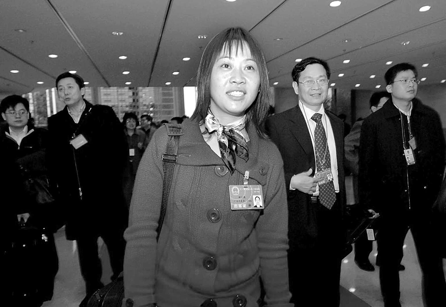 2008 年 3 月 2 日,首位农民工全国人大代表胡小燕(中)抵京,出席十一届全国人大一次会议