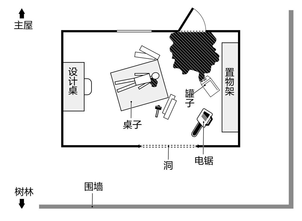 “是的。从切断面和木片散落的方式来看,应该是从内侧锯开的。而且用来锯洞的电锯,也摆放在小屋的架子上。昨天早上十一点多的时候,有家里人曾经听到过电锯的声音,那时应该就是凶手用电锯开洞的时间。因为死亡推定时间是早上十一点,所以使用电锯应该是在凶手杀人之后的事。”