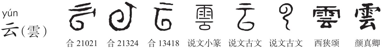 所谓‘画成其物,随体诘屈’者。”饶炯《部首订》:“云为山川湿气所生。其形在下,散而为气;其形在上,敛而为云。雲篆从古文云而加雨者,谓‘云行雨施’,云有雨,而其形义尤明也。”《诗经·小雅·白华》:“英英白云,露彼菅茅。”云遇冷凝结则为雨,故谓“云行雨施”,《说文》“雨,水从云下也”,故“雲”从雨云声。“云”甲骨文像云在天上(一、二)回环重叠形,云气在天,故云上之一或二表示天。中原地区冬天寒冷,人言说则口里有白气(如云)冒出,说话不绝若吞云吐雾,故“云”用作曰、言之义。又增雨作“雲”为本义通行字。古籍中“云”为曰、言义,“雲”为白云义之专字。简化字“云”用古文初形。