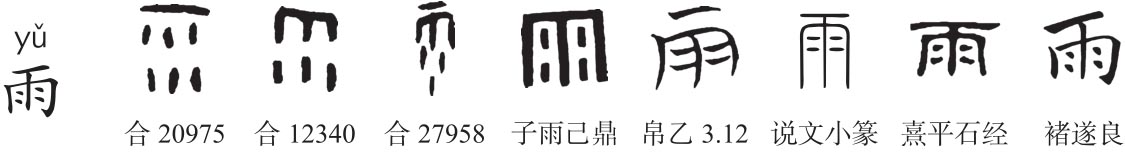 象形字。《说文》:“雨,水从雲下也。一象天,冖象雲,水霝其间也。