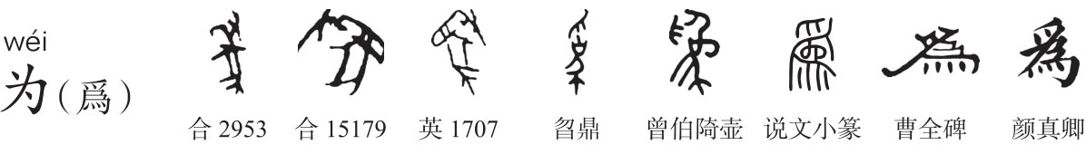 ,古文爲。象两母猴相对形。”许慎据小篆字形作母(猕)猴解,徐灏《注笺》:“母猴犹言猕猴,猴性好动,故爲字从爪,象猴形。”许慎“母(猕)猴”之训必有所承,构形亦与“爲”字作为义相合。凡劳作、作为,人则多用手,兽则多用爪,故古人以爪体现作为,而猕猴最为好爪好动,故“爲”从爪。“为”甲骨文从又牵象,会役象劳作之意,本义为作为。罗振玉《增订殷虚书契考释》:“为字古金文及石鼓文并作