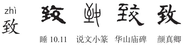 会意兼形声字。《说文》:“致,送诣也。从夊从至。”本义为送去、送到。《汉书·武帝纪》:“其遣谒者巡行天下,存问致赐。”颜师古注:“致,送至也。”夊(suī),《说文》:“行迟曳夊夊,象人两胫有所躧也。”本指行走迟缓,后作“绥”。徐灏《注笺》:“谓缓步而行夊夊然,若有所曳也。故通作绥。”“夊”小篆作