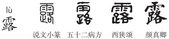 形声字。《说文》:“露,润泽也。从雨路声。”《玉篇》:“露,天之津液,下所润万物也。”本义为露水,空气中水汽因冷而凝结于地面或物体表面的水珠。《诗经·小雅·湛露》:“湛湛露斯,匪阳不晞。”露珠与雨滴形同,皆能润泽物,露水附于草木,在外表而显明,道路在外显而易见,故“露”从雨路声。