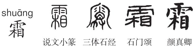 形声字。《说文》:“霜,丧也。成物者。从雨相声。”本义为自然界的霜,指靠近地面的空气在温度降到0℃以下时,所含水汽的一部分附着在地面上或靠近地面的物体上,凝结成的白色结晶体。朱骏声《通训定声》:“土气津液从地而生,薄以寒气,则结为霜。”“霜、丧”上古音皆为阳部,声近韵同,为声训。《释名》:“霜,丧也。其气残毒,物皆丧也。”《京房气候》:“霜成就万物。”张舜徽《约注》:“霜、雪皆有杀伤之力,凡为患禾稼之害虫,至是始尽,而后来年可望丰收。故古人云‘雪兆丰年’,又曰‘丰年之冬,必有积雪’,皆即此理。许训霜为丧,又申之曰成物者,亦斯意耳。”《诗经·秦风·蒹葭》:“蒹葭苍苍,白露为霜。”毛传:“白露凝戾为霜,然后岁事成。”霜、雨皆是水汽凝结而成,霜附着于地面,“相”有辅佐、辅助、附着等义,故“霜”从雨相声。