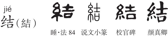 繁体作“結”,形声字。《说文》:“結,缔也。从糸吉声。”本义为打结,使条状物相交联形成疙瘩或用这种方式制成物品。徐灏《注笺》:“凡以绳屈之为椎,谓之结。”《周易·系辞》:“上古结绳而治,后世圣人易之以书契。”糸(mì),《说文》:“细丝也。象束丝之形。读若覛。