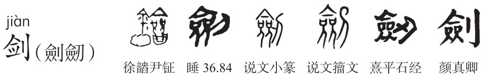 之为字,有柄有脊有刃矣。欲别作刃字,不能不从刀而以丶指其处,谓刃在是而已,刃岂突出一锋乎?”刀,《说文》:“兵也。象形。”为用于切、割、砍、削的器具的总名,也用作兵器名。僉(qiān),《说文》:“皆也。从亼从吅从从。”本义为皆、都。二人(从)二口(吅)集合(亼),三者都有皆义,故“僉”从亼从吅从从。“僉”简化作“佥”。剑身两边都有刃,两面都有脊,故“劒”从刃僉声。刀、刃形义相近而形符互用,故籀文从刀作“劎”,隶变作“劍”,为常用字。“劒”作“劍”,犹“刅”作“創”。“劒”金文从金作“鐱”。