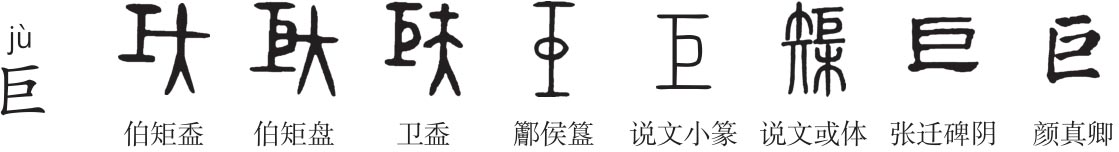 ,古文巨。”本义为规矩,木工的方尺,音jǔ,后作“矩”。《管子·宙合》:“成功之术,必有巨镬。”赵守正注:“巨镬,规矩。”段注:“规矩二字犹言法度,古不分别。”戴侗《六书故·工事》:“巨,工所用以为方也。”张舜徽《约注》:“巨之本义,盖即今木工所持方尺。凡作器之时,取材正倾,皆必以此为准,所谓不以规矩不能成方圆也。古初之矩,形制甚大,工必持之以行。”“巨”金文作