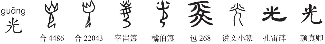 ”,是火光(炗)之上再加火光(炎)。“光”甲骨文、金文、小篆从火在人上,会火高照光明意。或谓“光”会人持火炬于头上照明之意,张舜徽《约注》“凡以火照物者,恒伸手高举其火。光字从火在儿(人)上,谓火光高出头上,非谓人头之上有火也”,故“光”从火在人上。