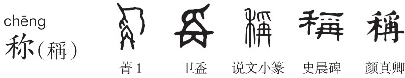 繁体作“稱”,形声字。《说文》:“稱,铨也。从禾爯声。春分而禾生,日夏至,晷景可度。禾有秒,秋分而秒定。律数:十二秒而当一分,十分而寸。其以为重:十二粟为一分,十二分为一铢。故诸程品皆从禾。”本义为称量,测物的轻重。段注:“铨者,衡也。《声类》曰‘铨所以称物也,稱俗作秤’。按爯,并举也。偁,扬也。今皆用稱,稱行而偁废矣。”“爯、偁、稱、秤”本一字。《周易·谦》:“称物平施。”孔颖达疏:“称此物之多少均平而施。”爯(chēnɡ),《说文》:“并举也。从爪,冓省。”本为手举物,后作“稱”。甲骨文作