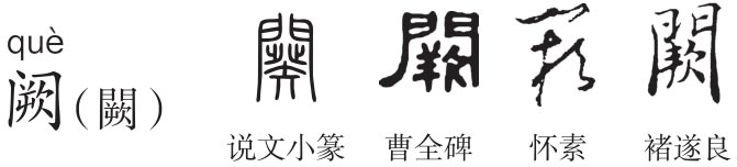 繁体作“闕”,形声字。《说文》:“闕,门观也。从門欮声。”宫门外两边的楼台,中间有路。徐锴《系传》:“盖为二台于门外,人君作楼观于上,上员下方。以其阙然为道谓之阙,以其上可远观谓之观,以其悬法谓之象魏,象悬书名也。”朱骏声《通训定声》:“凡平地四方而高者为台;不必方而高者为观;其在门左右者,中央空隙为路则谓之阙,亦曰两观,即《周礼》之象魏也。”《释名》:“阙,缺也。在门两旁,中央缺然为道也。”《左传·庄公二十一年》:“郑伯享王于阙西辟。”“欮”为“瘚”之或体,《说文》:“瘚,屰气也。从疒从屰从欠。欮,瘚或省疒。”本义为气逆,俗称岔气。也作“厥”。《释名·释疾病》:“瘚,逆气从下蹷起,上行入心胁也。”屰(nì),《说文》:“不顺也。从干下屮。屰之也。”本义指不顺。段注:“后人多用逆,逆行而屰废矣。”“屰”甲骨文作