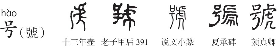 繁体作“號”,会意兼形声字。號(háo),《说文》:“呼也。从号从虎。”本义为呼叫。王筠《句读》:“呼当作嘑。”张舜徽《约注》:“呼、嘑、謼三字固各有专义,然古人多通用呼。许书以推明本义为主,而说解中不必皆用本字也。號训为呼,呼犹叫也,谓兽叫之声。兽声以虎哮最大,故从虎。此与口部嗥之或体獆从犬同意,犬亦叫声最厉者。”《诗经·魏风·硕鼠》:“乐郊乐郊,谁之永號。”毛传:“號,呼也。”号(háo),《说文》:“痛声也。从口在丂上。”本义为大声哭叫。段注:“凡嗁號字古作号。口部曰‘嗁,号也’,今字则號行而号废矣。丂者气舒而碍,虽碍而必张口出其声,故口在丂上,号咷之象也。”“丂”下“