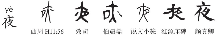 形声字。《说文》:“夜,舍也。天下休舍也。从夕,亦省声。”本义指天黑到天亮一段时间,与“日、昼”相对。段注:“休舍犹休息也。舍,止也。”徐灏《注笺》:“夜之言舍也,夜与亦一声之转。”万物至夜晚而息止,故训“天下休舍也”。《春秋·庄公七年》:“夏四月辛卯夜,恒星不见。”孔颖达疏:“夜者,自昏至旦之总名。”“亦”为“腋”本字,指人的腋窝,小篆作