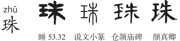 ,木中一点表示赤心。“朱”由赤心木转指大红色。古人重玉,物之贵美者多冠以玉名,珍珠温润如玉,故珠玉连称,珠在蚌壳中如赤心在朱木中,故“珠”从玉朱声。徐锴《系传》:“珠之在蚌腹,与月亏全。今人以美珠以缯帛包之,灼之以火而帛不焦,故王孙圉云‘以御火灾’。”