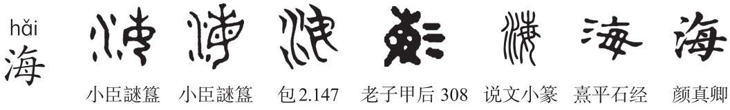 形声字。《说文》:“海,天池也。以纳百川者。从水每声。”本义指承受大陆江河流水的最大水域,后指邻接大陆而小于洋的水域。《玉篇》海部:“海,大也,受百川,万谷流入。”段注:“凡地大物博者皆得谓之海。”《释名·释水》:“海,晦也,主承秽浊,其水黑如晦也。”“每”甲骨文作