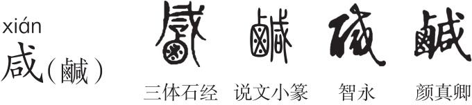 ,从戌从口,戌为斧钺类兵器。上古战争多,部族竖立武器(戌)呼集(口)全体部落男子参加,有皆、悉义,故“咸”从口从戌。为副词,表示范围,相当于“都、全”。“鹹”指盐味,盐为“鹵”,咸盐味是最普遍、基础之味,饮食不可缺少,故“鹹”从鹵咸声。简化字省鹵作“咸”。