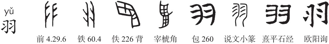 象形字。《说文》:“羽,鸟长毛也。象形。”本为鸟翅上长而扁的毛。段注:“长毛,别于毛之细缛者。”王筠《句读》:“谓异于背上之毛、腹下之毳也。”饶炯《部首订》:“鸟长毛者,谓鸟翅之长毛也,篆象两翼未舒之形。”“羽”甲骨文