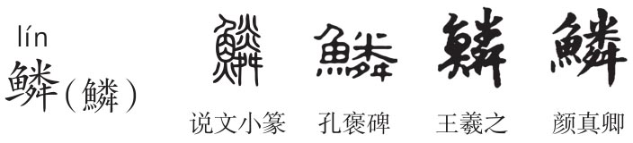 繁体作“鱗”,形声字。《说文》:“鱗,魚甲也。从魚粦声。”本义指鱼类动物密排于身体表层的薄片状组织,泛指动物身上的鳞片。鱼鳞似铠甲有保护作用,故训“鱼甲”,《楚辞·九歌·河伯》:“鱼鳞屋兮龙堂,紫贝阙兮朱宫。”“魚”指水生脊椎动物,甲骨文作