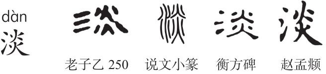 形声字。《说文》:“淡,薄味也。从水炎声。”本义为味道不浓。段注:“醲之反也。酉部曰:醲,厚酒也。”《老子》三十五章:“道之出口,淡乎其无味。”炎,《说文》:“火光上也。从重火。”本义为火光升腾,《尚书·洪范》:“火曰炎上。”孔颖达疏引王肃:“火之性,炎盛而升上。”火光升腾则上下皆是火,故“炎”从重火。火光盛大是大火,故引申有旺盛、盛大义。“淡”指味道轻薄,水味最淡,淡味最长久、盛大,《汉书·扬雄传》“大味必淡,大音必希”,颜师古注:“淡,谓无至味也。”故“淡”从水炎声。