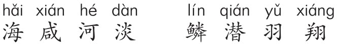 “鳞潜羽翔”出自《诗经·大雅·旱麓》“鸢飞戾天,鱼跃于渊。岂弟君子,遐不作人”,言圣人之德,犹鸟飞于天、鱼游于水般上下明察。《千字文》变换《诗经》语句,改为“鳞潜羽翔”,意思相同。“鳞”代表一切鱼类,也为水中动物的代称。“羽”代表一切飞禽走兽,也为地上动物的代称。