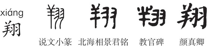 形声字。《说文》:“翔,回飞也。从羽羊声。”指鸟展翅旋飞而翅不扇动。桂馥《义证》:“‘回飞也’者,旋飞也。”《慧琳音义》“翱翔”注引《字统》:“飞不动翅曰翔。”段注:“高注《淮南》曰:‘翼上下曰翱,直刺不动曰翔。’”《周易·丰》:“丰其屋,天际翔也。”鸟以羽飞翔,鸟盘旋而上若羊角回旋卷曲,《庄子·逍遥游》“抟扶摇羊角而上者九万里”,成玄英疏:“旋风曲戾,犹如羊角。”故“翔”从羽羊声。