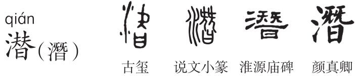 《说文》作“潛”,形声字。《说文》:“潛,涉水也。一曰藏也。一曰汉水为潛。从水朁声。”本指涉水或没水游渡。段注:“《邶风》传云:由膝以上为涉。然则言潜者,自其膝以下没于水言之,所谓泳也。”《庄子·达生》:“至人潜行不窒,蹈火不热。”朁(cǎn),《说文》:“曾也。从曰兓声。《诗》曰:朁不畏明。”义为曾、竟,用作副词表示出乎意料之外。今本《诗》写作“憯”。“曰”指言说,甲骨文作