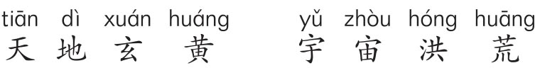 “天地玄黄”出自《周易·坤》文言:“夫玄黄者,天地之杂也,天玄而地黄。”此段调整《周易》的文字为“天地玄黄”,字序虽改,字义未变。