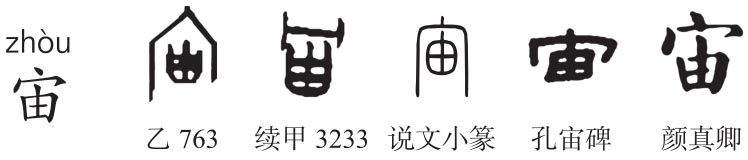 形声字。《说文》:“宙,舟舆所极覆也。从宀由声。”本义为栋梁。段注:“然则宙之本义谓栋,一演之为舟舆所极复,再演之为往古来今。”徐灏《注笺》:“宙字从宀,其本义自谓宫室。”《淮南子·览冥》:“而燕雀佼之,以为不能与之争于宇宙之间。”高诱注:“宇,屋檐也;宙,栋梁也。”极,至;覆,反。舟舆所极覆,段注:“谓舟车自此至彼而复还此,如循环然。”桂馥、王筠、徐灏等以为当从“舟舆所极,覆也”断句,徐灏《注笺》:“许意谓舟车所至无不覆帱也。”王筠《句读》:“‘舟舆所极’即舟车所至,‘覆也’者,犹言天之所覆,又加此句者,为字从宀也。”《说文》无“由”字,学者多谓“甾”即“由”。甾(zī),《说文》:“东楚名缶曰甾。象形。