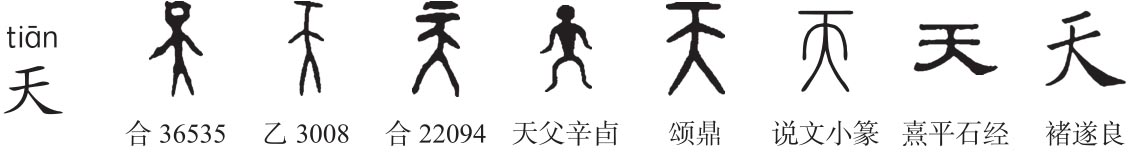 象形字,一说指事字。《说文》:“天,颠也。至高无上,从一、大。”本指人的头顶、脑袋。“天”上古音为透纽真部,“颠”为端纽真部,二字声近韵同,为声训。声训又称音训,指通过声音相同或相近的字来解释词义,推求音义同源关系,以说明其命名的原由。章太炎《小学答问》:“天即颠耳。颠为顶,亦为额。”“天、颠、顶”声近义通,都有头顶义。《山海经·海外西经》:“刑天与帝争神,帝断其首,葬之常羊之山。乃以乳为目,以脐为口,操干戚以舞。”刑天头被砍去,故以此特征名为“刑天”。“天”甲骨文、金文从大,以上部圆形示人之头部。卜辞中“天、大”多混用。甲骨文、金文又将表示头部的圆形线条化,变圆为横,小篆承之,隶书作