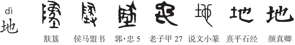 形声字。《说文》:“地,元气初分,轻、清、阳为天,重、浊、阴为地。万物所陈列也。从土也声。