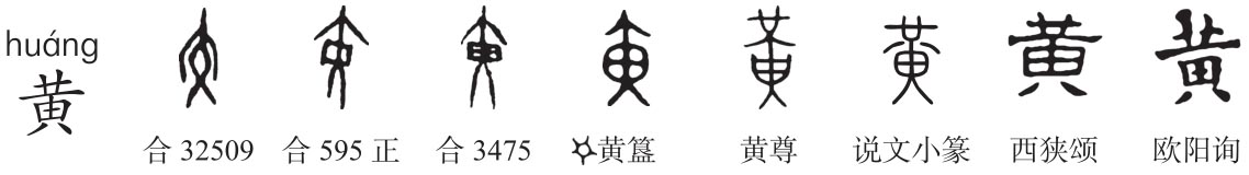 ,古文黄。”为五色之一,指像中原地区土地一样的颜色。《周易·坤》:“天玄而地黄。”孔颖达疏:“天色玄,地色黄。”《尚书·禹贡》分九州之土为三等九级,位于中部地区的雍州属黄色土壤,性质柔和,称“厥田上上”,列为第一。中原土色为黄,故以黄为中央之色,《论衡·验符》:“黄为土色,位在中央。”《礼记·郊特牲》谓“黄者中也”,故有“黄中”一词。“黄”为地之色,田即地,段注:“土色黄,故从田。”饶炯《部首订》:“黄为土之色,而其字从田者,盖田亦土。”“炗”为古文“光”,火苗(火)上空的光(廿)多为黄白色,光、黄音近义通,《释名·释采帛》“黄,晃也,犹晃晃象日光色也”,《风俗通·皇霸》引《尚书大传》“黄者,光也,厚也,中和之色也”,故“黄”从田从炗,炗亦声。于省吾《说卜辞的焚巫尪与作土龙》:“甲骨文里过去被认作‘交’的字,可能多数是‘黄’字……唐兰先生认为‘黄字古文象人仰面向天,腹部膨大,是《礼记·檀弓》“吾欲暴尪而奚若”的“尪”的本字’。这是很精辟的见解。‘黄’、‘尪’音近,《吕氏春秋·明理》高诱注:‘尪,短仰者也。’同书(《吕氏春秋》)《尽数》注:‘尪,突胸卬向疾也。’尪人突胸凸肚,身子显得特别粗短,