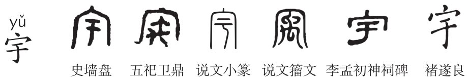 ,籀文宇从禹。”本义为屋檐。段注:“宇者,言其边,故引伸之义又为大。《文子》及《三苍》云:‘上下四方谓之宇,往古来今谓之宙。’上下四方者,大之所际也。”《诗经·豳风·七月》:“七月在野,八月在宇。”陆德明释文:“宇,屋四垂为宇。《韩诗》云:宇,屋霤也。”宀(mián),《说文》:“交覆深屋也。象形。”本指人字形顶的房屋。“宀”甲骨文作