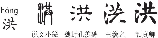 形声字。《说文》:“洪,洚水也。从水共声。”本义指大水。“洚”指洪水,洪、洚上古音声近韵同,为声训,二字也是同源字。共,《说文》:“同也。从廿、廾。