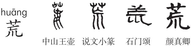 宫》:“奄有龟蒙,遂荒大东。”田地弃耕则荒芜,故也指荒废、弃置,《尚书·盘庚》:“无荒失朕命。”沉溺于玩好则荒废正业,故又指沉溺、迷乱,如荒淫无度,《尚书·五子之歌》:“内作色荒,外作禽荒。”孔颖达疏:“好色好田则精神迷乱,故迷乱曰荒。”田荒则无收成,凶年无收成,故又指收成不好、凶年,《韩诗外传》:“三谷不升谓之馑,四谷不升谓之荒。”荒年粮食缺乏,故又指事物严重缺乏,如煤荒、菜荒。荒芜是衰败之象,故又指败亡,《逸周书·大明武解》:“靡敌不荒,阵若云布,侵若风行。”田荒芜则唯有荒草而无余物,故又指虚空,《诗经·大雅·桑柔》:“哀恫中国,具赘卒荒。”郑玄笺:“皆见系属于兵役,家家空虚。”古人重视农耕,田地荒芜被视为不合理,故又指不合情理,如荒谬、荒诞,《晋书·祖逖传》:“中夜闻荒鸡鸣。”偏远地带多荒芜,故又指离国都最远的地方,《尚书·禹贡》把王都以外的地方分为“甸、侯、绥、要、荒”五服,荒服最远,《尚书·禹贡》:“五百里荒服。”孔传:“要服外之五百里言荒。”又泛指边远之地,如四荒、八荒、大荒等。荒野偏僻荒凉,故又指偏僻、冷落,如荒郊野外。又指扩大、开拓,《诗经·周颂·天作》:“天作高山,大王荒之。”或谓大义是“巟”之引申义,段注:“引申为凡广大之称。《周颂》:‘天作高山,大王荒之。’传曰:‘荒,大也。’凡此等皆叚荒为巟也。荒,芜也。荒行而巟废矣。”荒芜则环境杂乱,惊慌则心神杂乱,故又指惊慌、急迫,后作“慌”,卢藏用《陈子昂别传》:“将欲害之,子昂荒惧,使家人纳钱二十万。”