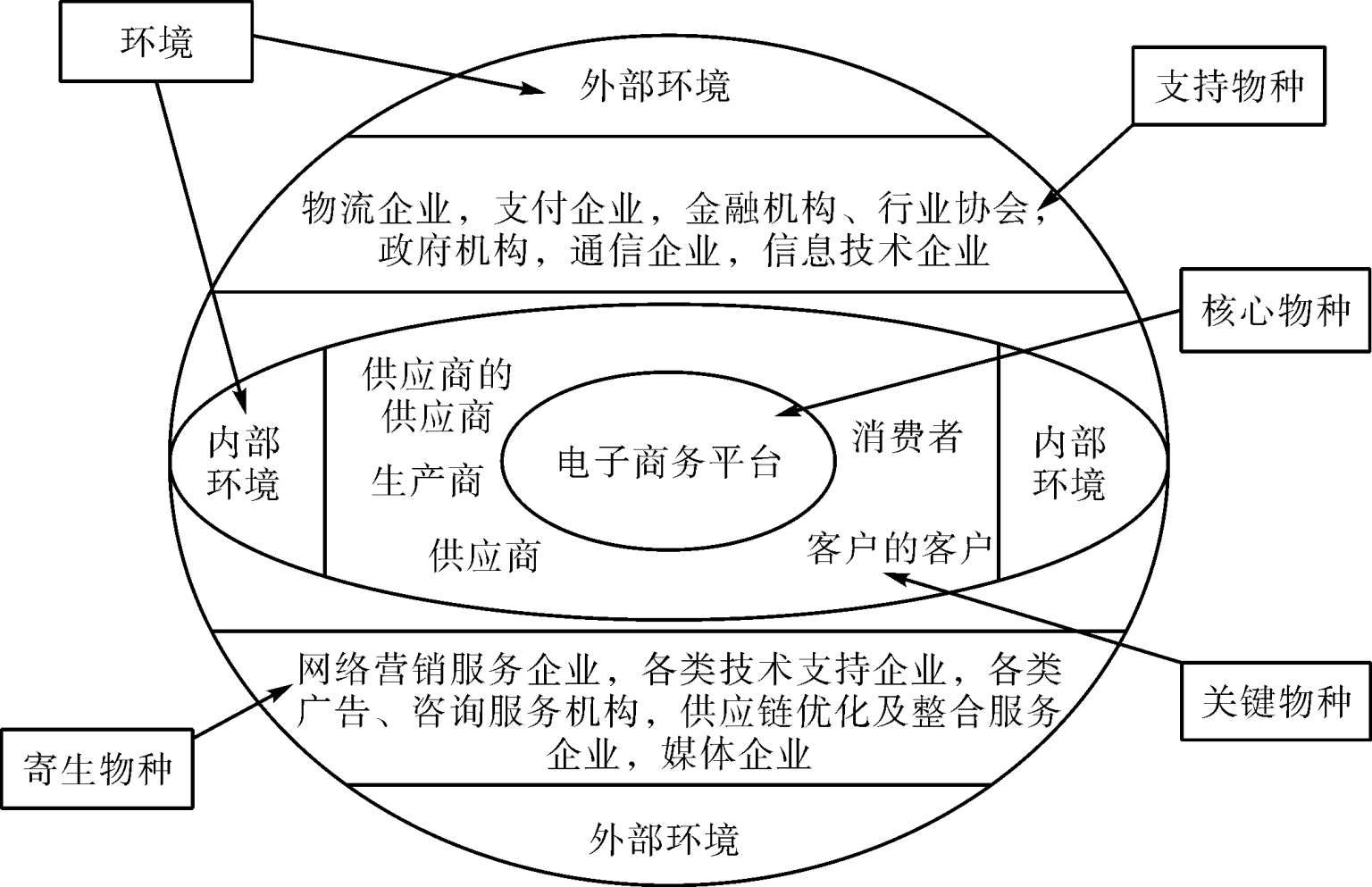(4)寄生物种,即电子商务交易提供增值服务的服务提供商等,包括网络营销服务商、各类技术外包服务商、电子商务咨询服务商、供应链优化及整合服务商、物流增值服务项目提供商、各类广告服务提供商等。
