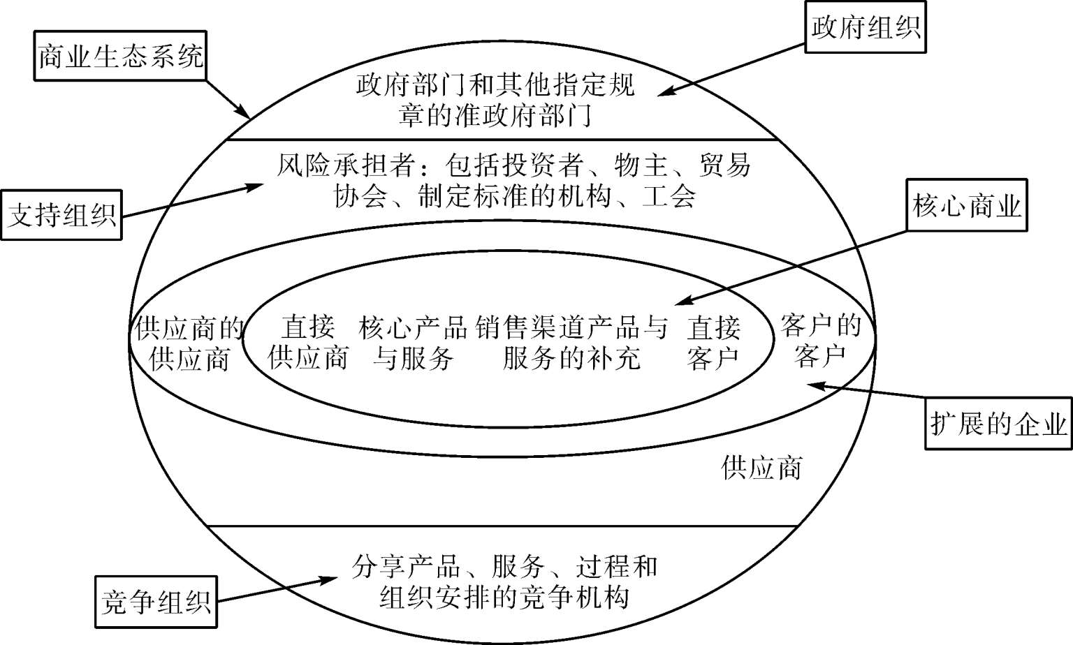 国内学者陆玲较早关注商业生态系统,于1996年提出企业生态学原理与企业生态系统概念,提出了企业生态系统是企业与企业的生存环境构成的统一体。虽然,后续有一些学者相继对企业生态系统进行阐述,但从其概念看,企业生态系统就是商业生态系统。韩福荣(2002)以物种为划分角度,将企业生态系统分为生物成分与非生物成分两部分,其中,生物成分包括企业个体及群体、消费者、市场中介、供应商及投资者等主要物种,非生物成分包括政治形势、经济环境、政策法令、科技发展水平、劳动力知识水平及自然资源等。杨忠直(2003)结合自然、经济与社会环境概念,提出商业生态系统是在一定时期与一定的空间内由企业、消费者、市场及其所在的自然环境、经济环境与社会环境组成的整体系统。此外,有一些学者从商业生态系统的构成要素角度加以剖析,如王兴元(2005)提出商业生态系统理论是供应链理论的进一步发展;陆杉等(2007)认为商业生态系统除了一般意义的供应链(商业生态系统的核心部分)外,还应包括政府机构与其他管理组织、供应链的行业协会等组织、同类的供应链(商业生态系统的扩展部分);欧阳泉(2013)认为商业生态系统是以组织和个人与其所处生态环境形成的相互作用、相互依赖、共同发展的一种松散经济联合体,是强调为适应或改善环境而组成的共同体,商业生态系统的成员除了企业自身外,还包括消费者、供应商、生产者、流通者、竞争者等经济联合体,以及管理咨询、科研机构、社会团体等相关的组织团体。