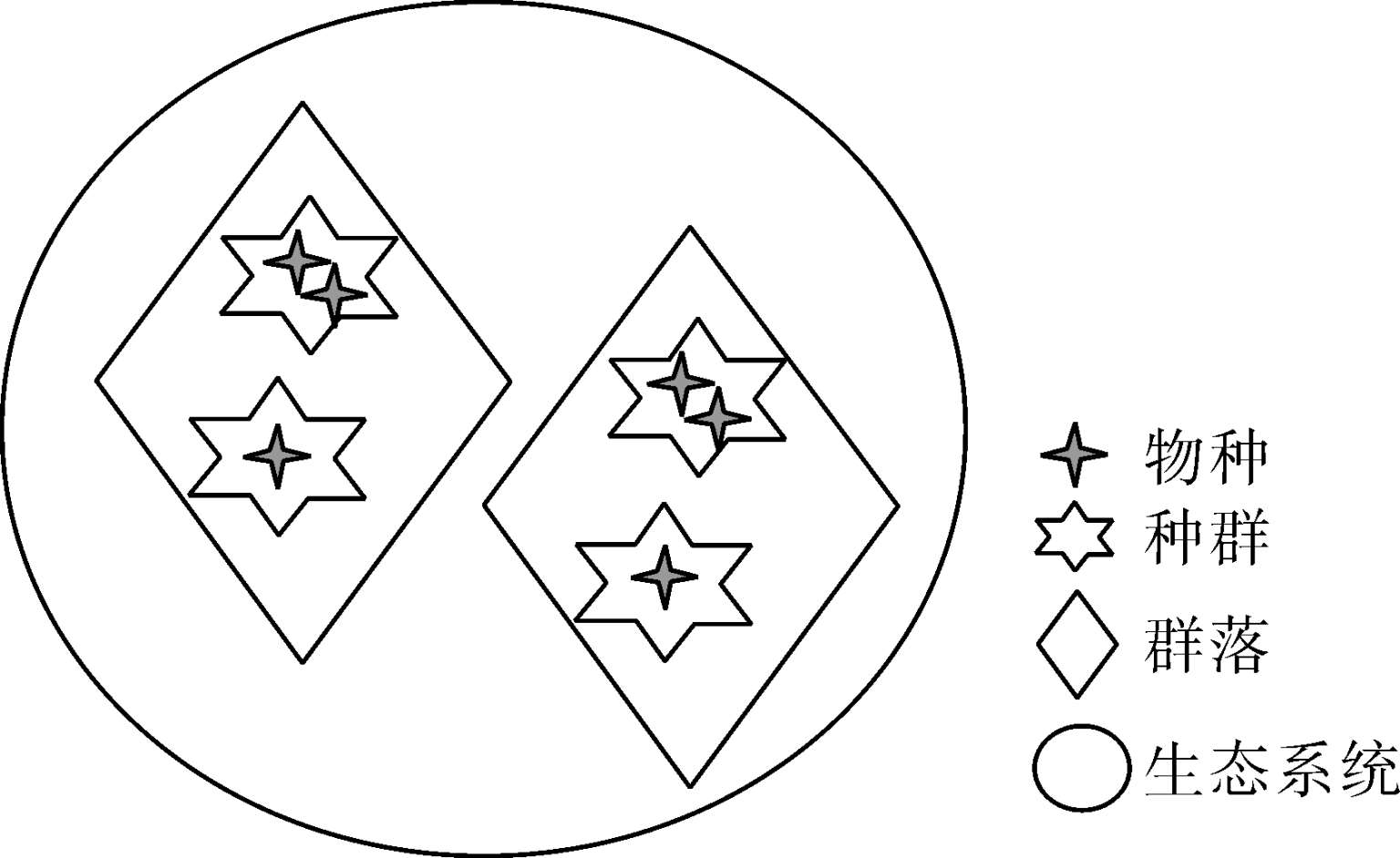 种群由物种构成,但不等同于物种的个体简单相加,除了物种的集合外,还包括物种的个体间非独立性的交互作用与影响。群落是相同时间聚集在同一地段上的各物种种群的集合。其概念较早由生物群落生态学先驱Shelford(1911)提出,定义生物群落为种类组成和外貌一致的生物聚集体。美国著名生态学家Odum(1957)在《生态学基础》中对该定义进行了补充,提出除了种类组成与外貌一致外,还具有一定的营养结构和代谢格局,群落是生态系统中最具生命的部分,也是生态学中最重要的原理之一,即各种不同的物种能在有规律的方式下共处。此外,群落还被定义为在特定的空间或特定的生存环境下种群有规律的组合,它们之间以及它们与环境之间彼此影响,相互作用,具有一定的形态结构和营养结构,并执行一定的功能。图2-1详细描述了生态系统的构成结构。