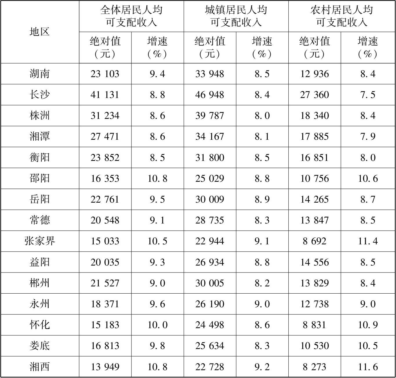 。可以看出,邵阳城乡居民可支配收入绝对额不高,但增速较快,尤其是2017 年农村居民可支配收入增速仅低于湘西、张家界和怀化,位居湖南第 4 位。